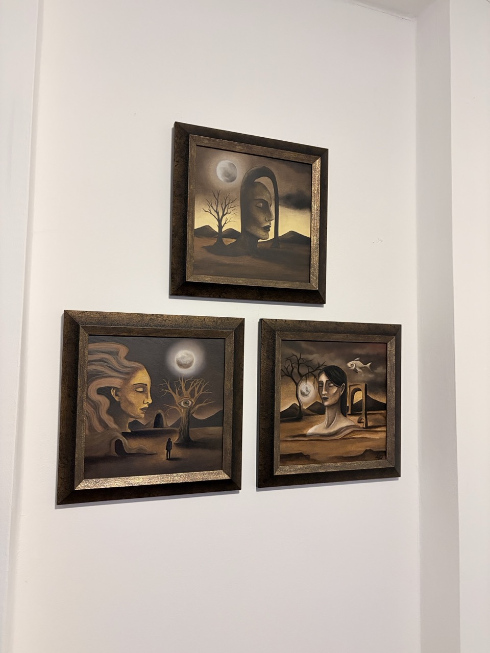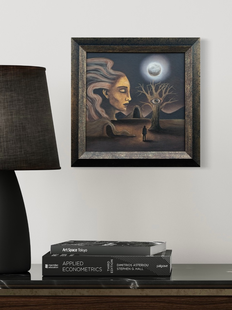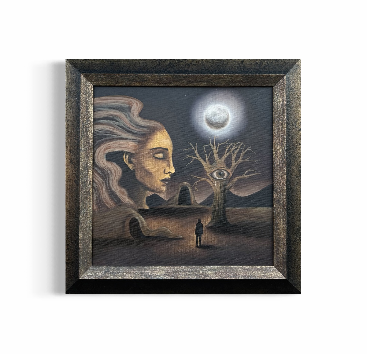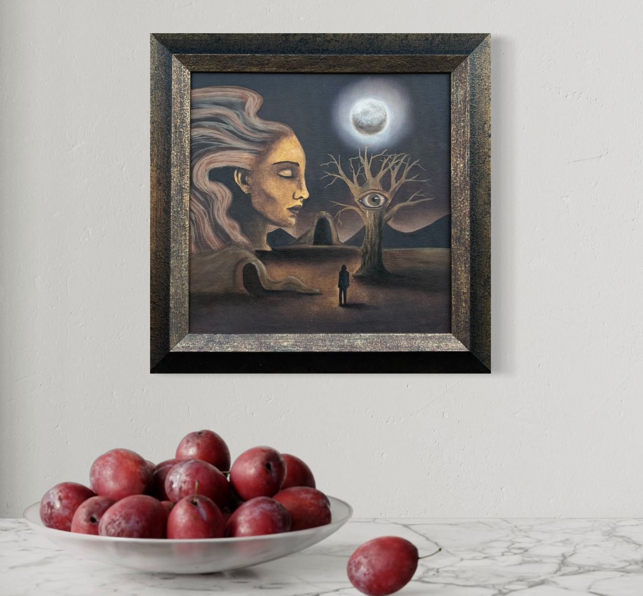 Strážce noci Název: Strážce noci Rok vzniku: 2025, Velikost: 32x32 cm, (s rámem) Typ: surrealismus Medium: olejové barvy, plátno na desce, Signováno: zadní strana Cena: 3 800,-